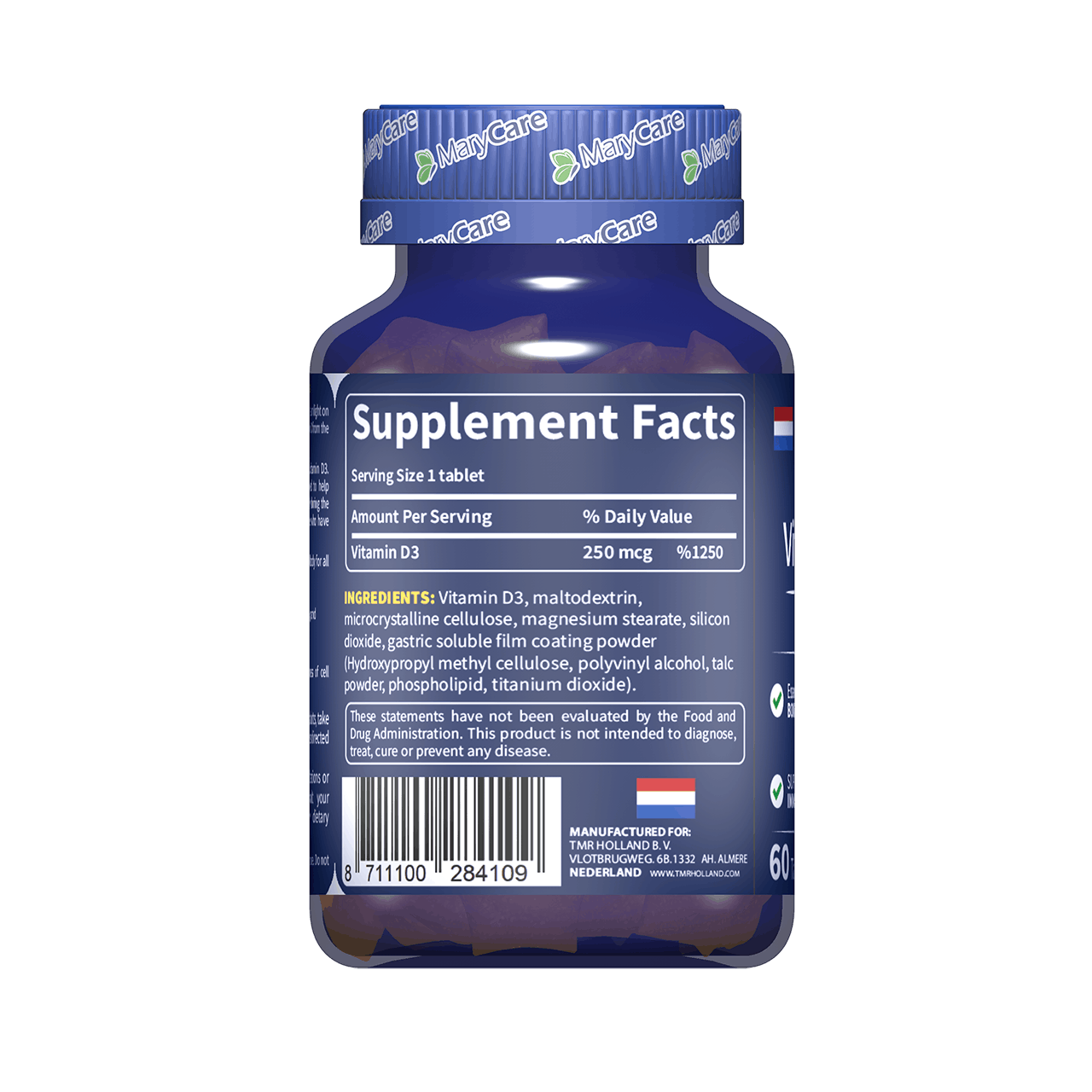 Vitamin D is primarily synthesized from the action of sunlight on the skin. It is difficult to attain the right amount of Vitamin D from the sun as too much sun exposure can harm the skin. Mary care Vitamin D3 tablets provide 10.000IU of Vitamin D3 in tablets.
